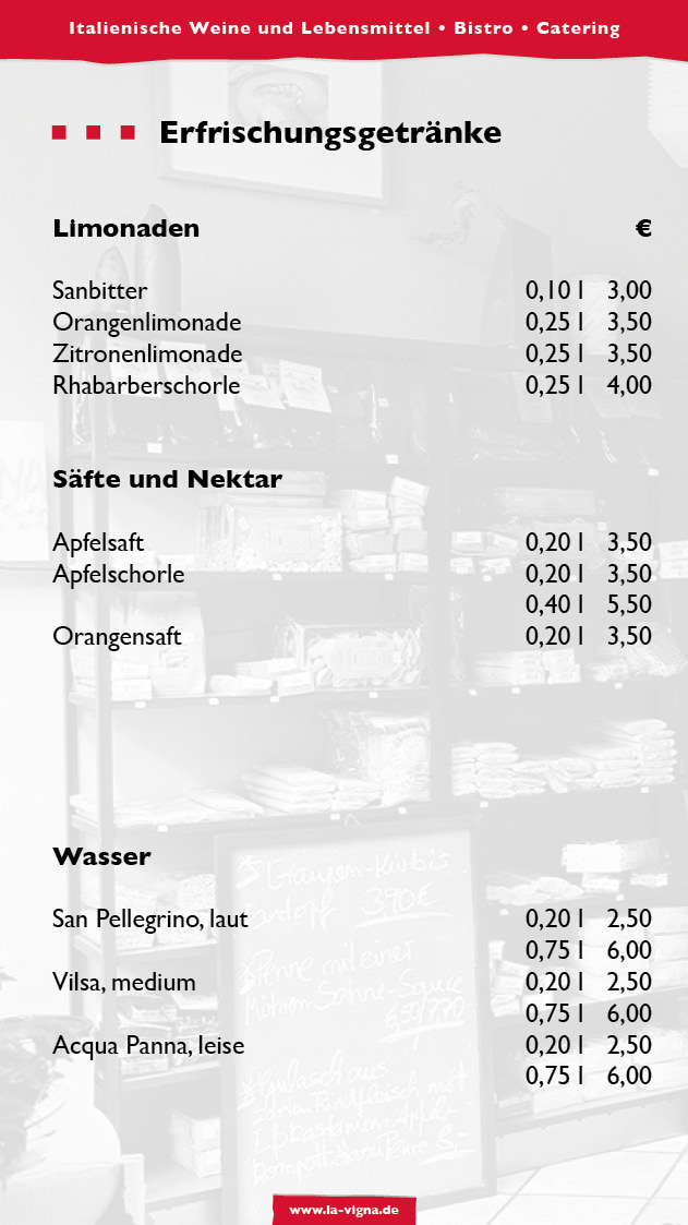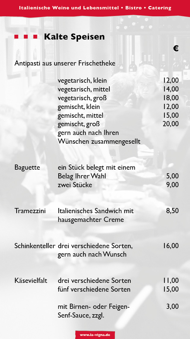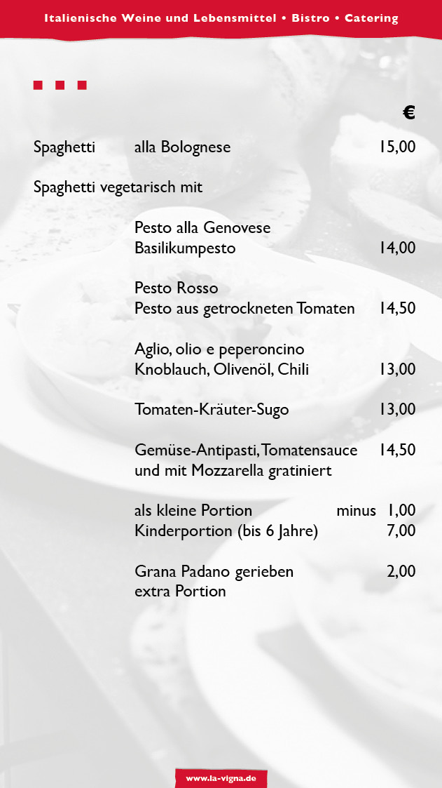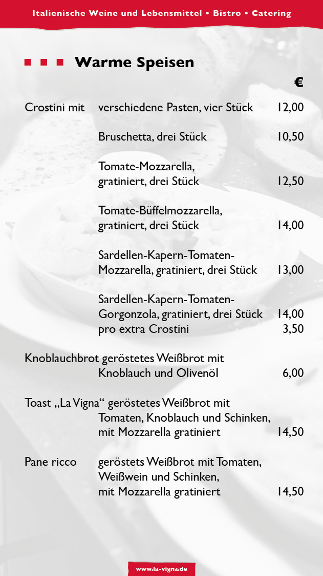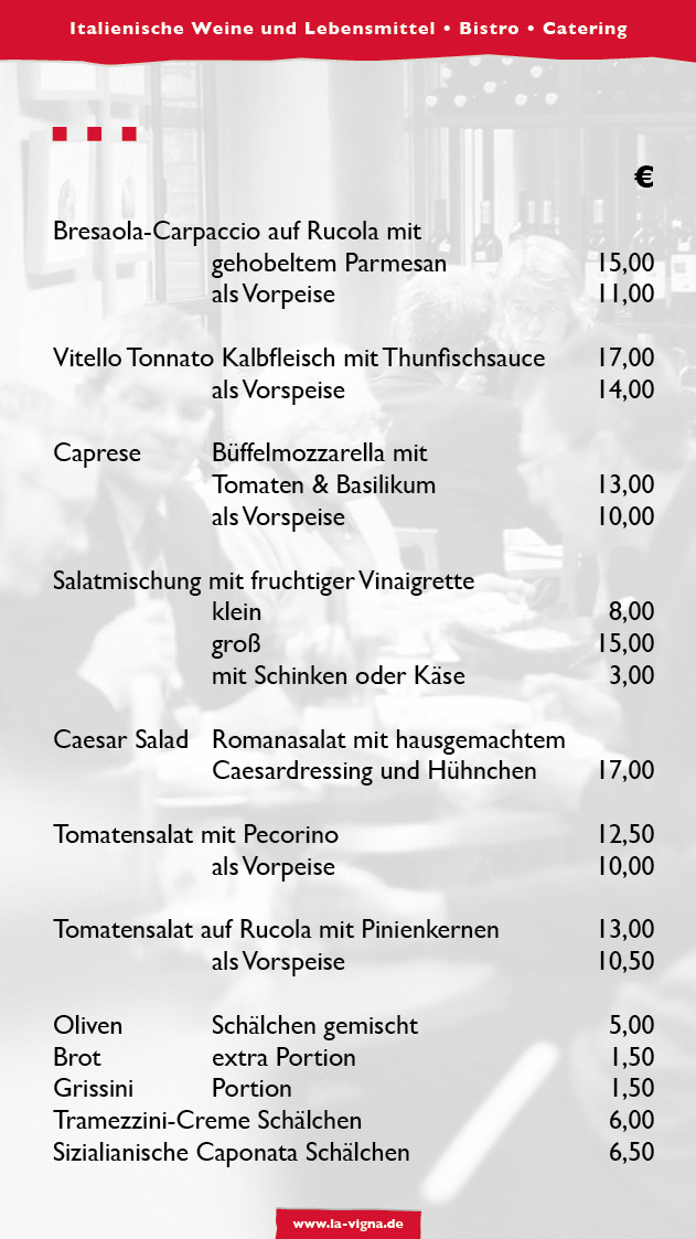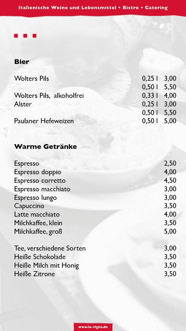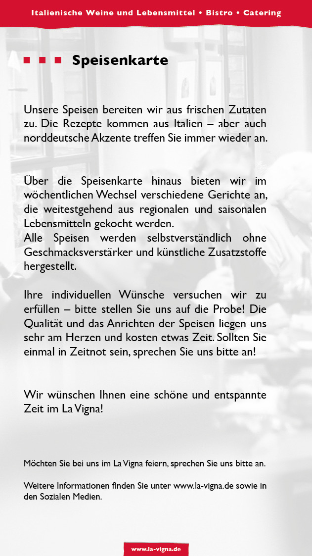 Unsere Speisen bereiten wir aus frischen Zutaten zu. Die Rezepte kommen aus Italien – aber auch norddeutsche Akzente sind immer mal wieder anzutreffen.